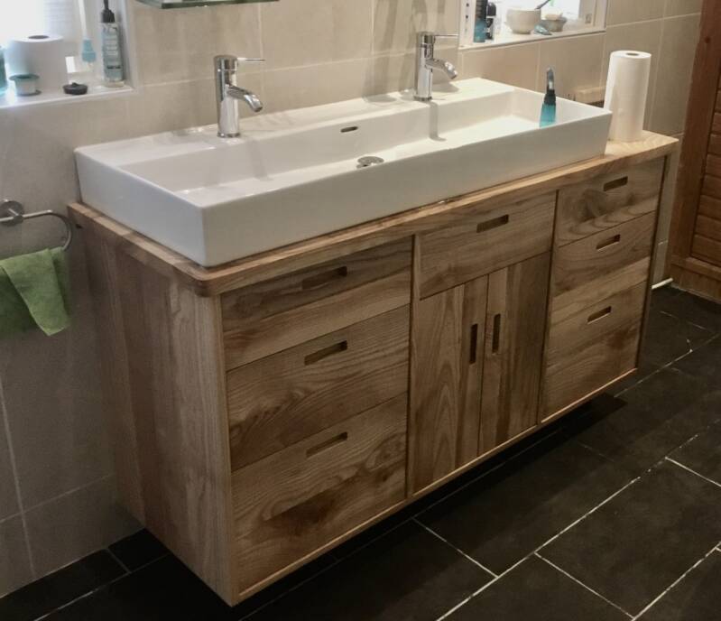 De klant vond dat juist een pré, dus ik heb er een mooie compositie van gemaakt. Het Kamper essenhout is harder dan het gangbare essenhout waar ik ook veel mee werk, en het heeft een veel extremere tekening. Het laat zich heel goed verwerken en is tot nu toe ook heel stabiel. De afwerking van deze meubels is gedaan met transparante 2K-olie (naturel) en matte 2K-lak van Blue Dolphin voor een optimale bescherming. Door de olie komen de contrasten in het hout extra mooi naar voren.
