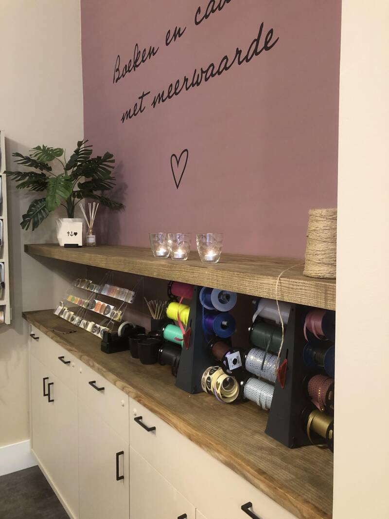 Voor een winkel in de binnenstad van Kampen hebben we een toonbank op maat gemaakt van Stadshout afkomstig uit Kampen Zuid. Met een lengte van bijna 4 meter in een bocht biedt deze veel ruimte, niet alleen voor de kassa's, maar ook voor decoratie. De achterwand is voorzien van een inpaktafel met een wandplank van 2,5 meter, welke 'blind' is bevestigd aan de muur.